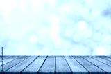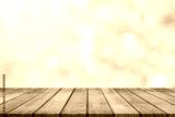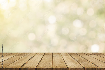 Wood floor with blurred trees of nature park background and summer season, product display montage