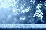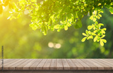 Wood floor with blurred trees of nature park background and summer season, product display montage