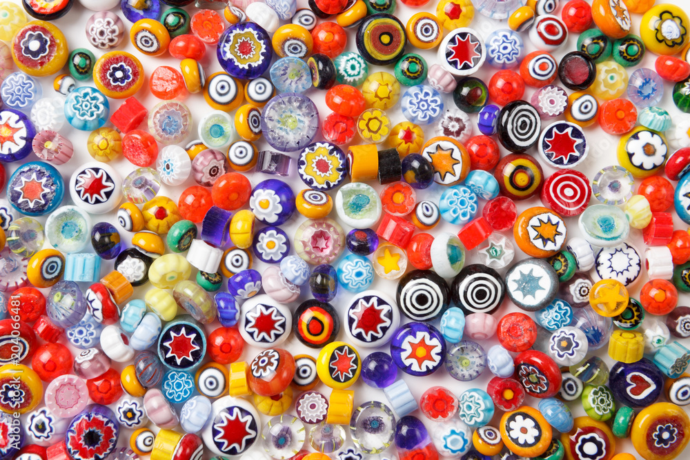 Collection of colorful glass beads. Colored Venetian, Murano glass, millefiori.