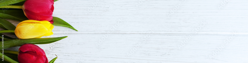 Wooden white background with tulips. Banner for website. Conception holiday, March 8, Mother's Day.