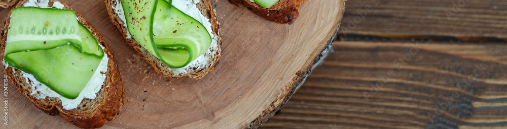 Sandwich with feta cheese and cucumber on a wooden board. Top view. Banner for website. The concept of food and vegetarianism.