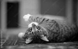 Portrait of the striped cat lying on a carpet.