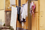 Dry clothes on clothesline, drying things on the street on the balcony of the house