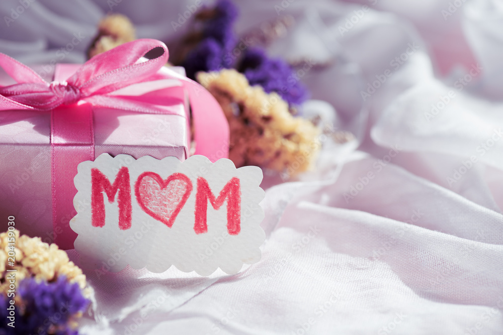 Happy mother's day concept. Gift box with purple flower, paper tag with LOVE MOM text and two handmade red heart on white cheesecloth background.