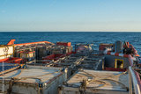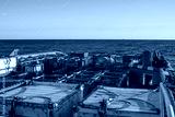 Marine cargo operations, offshore supply boat with containers and tanks onboard delivers cargo to oil rig platform. Calm sea. Dp supplier job. oil and gas research and mining indusrty