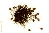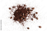 Pile of powder, instant coffee and beans isolated on white background, top view