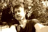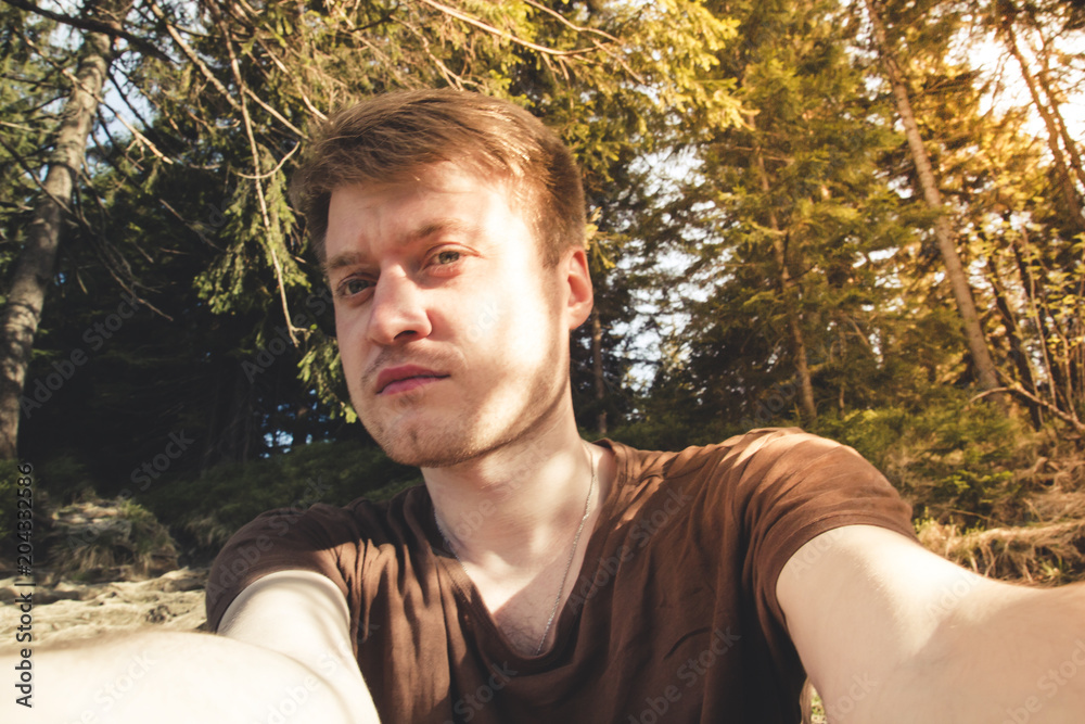 Portrait of a young handsome guy with a small stubble who takes a selfie on the background of a coniferous forest at sunset