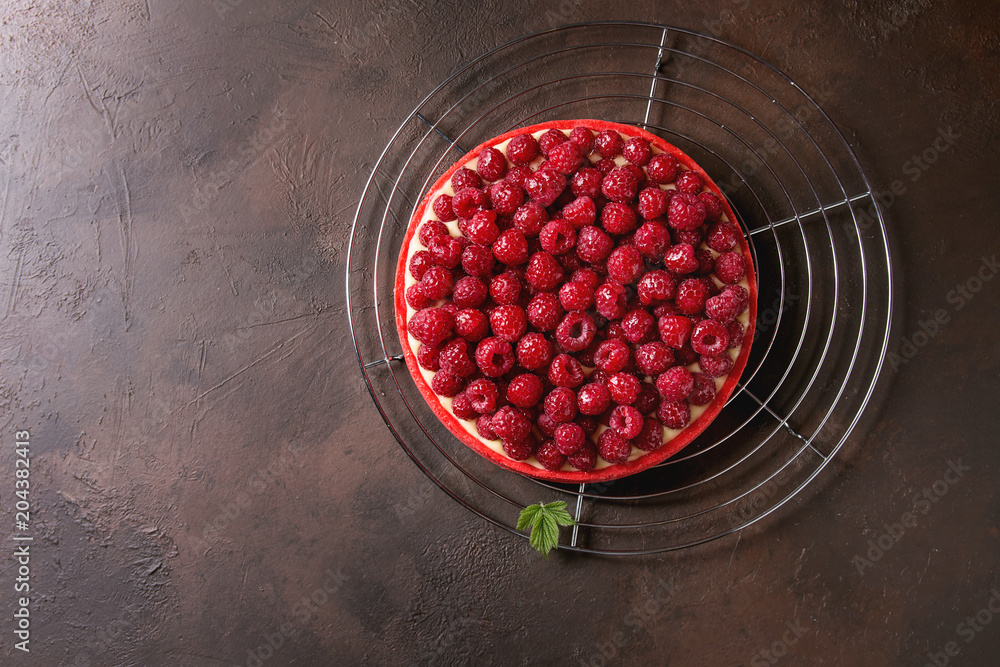 Red raspberry shortbread tart with lemon custard and glazed fresh raspberries served on cooling rack over dark brown texture background. Top view, copy space.