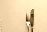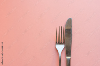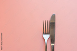 Directly above cropped view of knife and fork on pink background - dining, food, diet concept