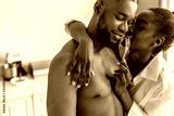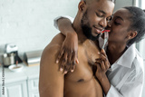 african american girlfriend hugging boyfriend and giving him piece of strawberry at kitchen