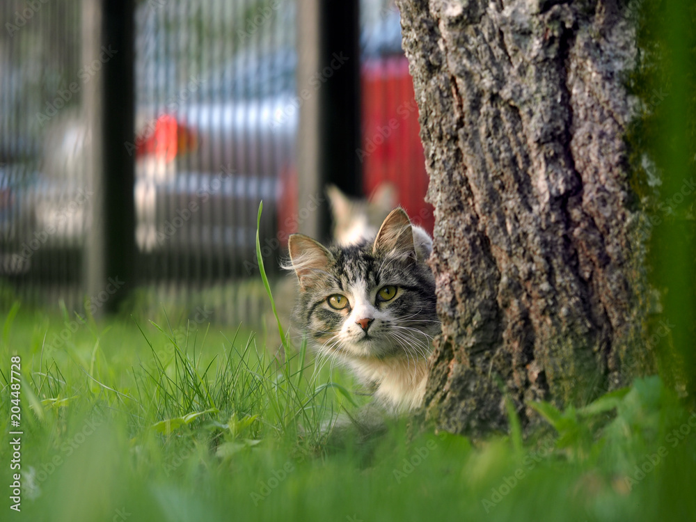 Cat peeking out from behind tree of