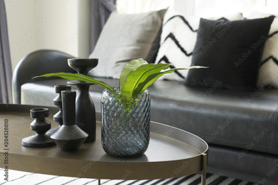 black modern vase and green leaf on center table with black and white pillows on sofa in background