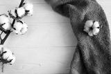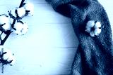Branch of cottton and violet towel on the white wooden background.Top view.