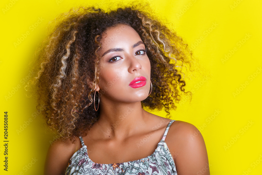 Beauty portrait of young african american girl with afro hairstyle. Girl posing on yellow background,