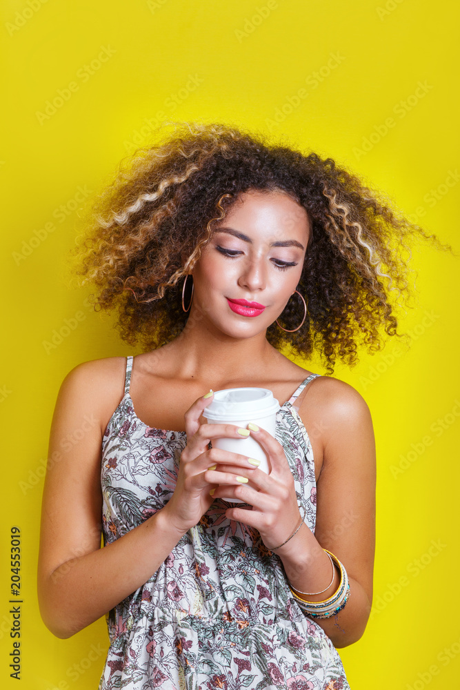 Beauty portrait of young african american girl with afro hairstyle. Girl posing on yellow background, looking at camera.