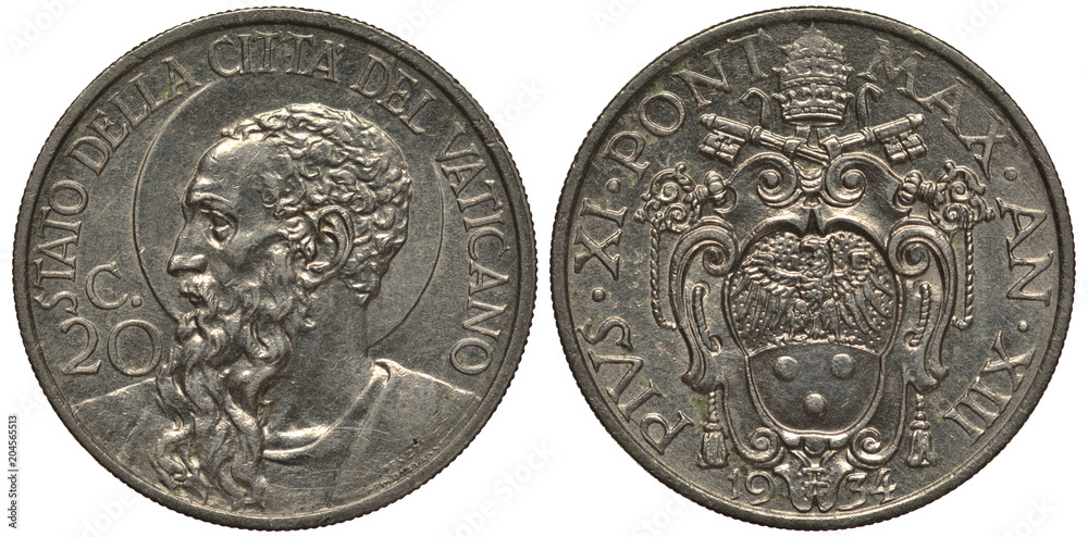 Vatican city coin twenty centesimo 1934, St. Paul bust left, papal arms, keys, tiara, shield with eagle, nickel,