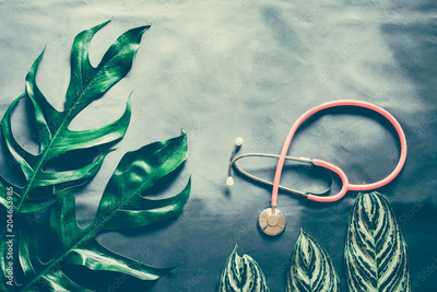 Green leaves plant growing wit pink stethoscope, the tropical plant.