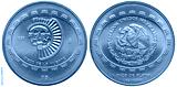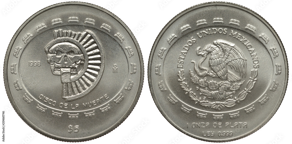 Mexico, Mexican coin five peso 1988, Aztec disk of death, Aztec sculpture, arms, eagle on cactus catching snake, silver,