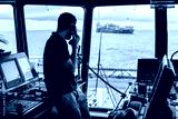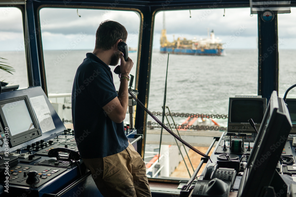 Deck navigation officer on the navigation bridge. He speaks by VHF radio, GMDSS Watchkeeping, collision prevention at sea. COLREG