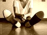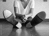 Black and white version of Bottom of tap shoes of a dancer
