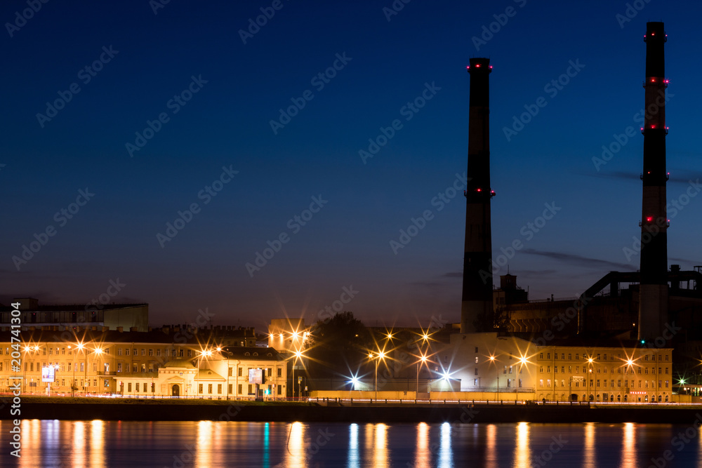 The evening thermal power station on the Neva river embankment in Saint Petersburg, Russia