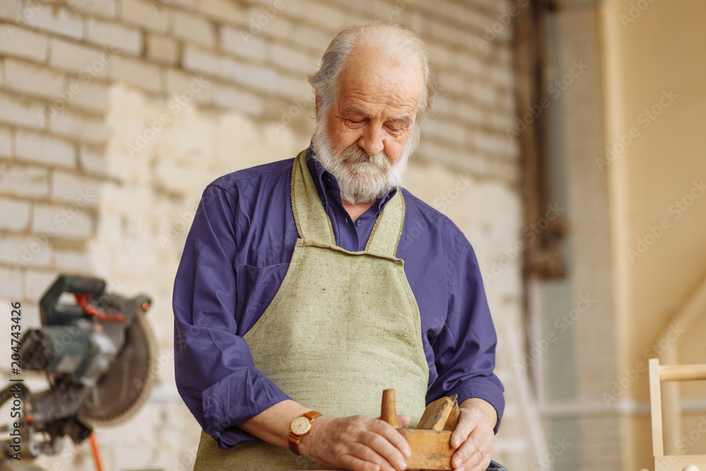 old craftsman has made wooden plane in the garage. close-up portrait