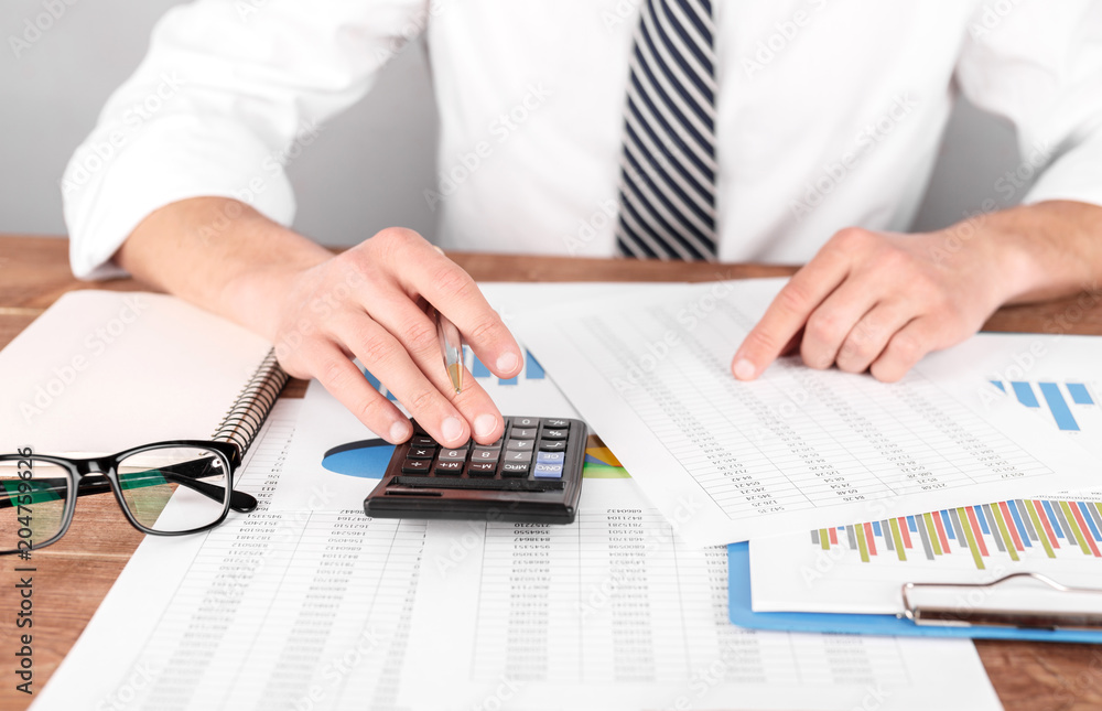 Businessman analizing summary report and reviewing accounting data and calculate order income.