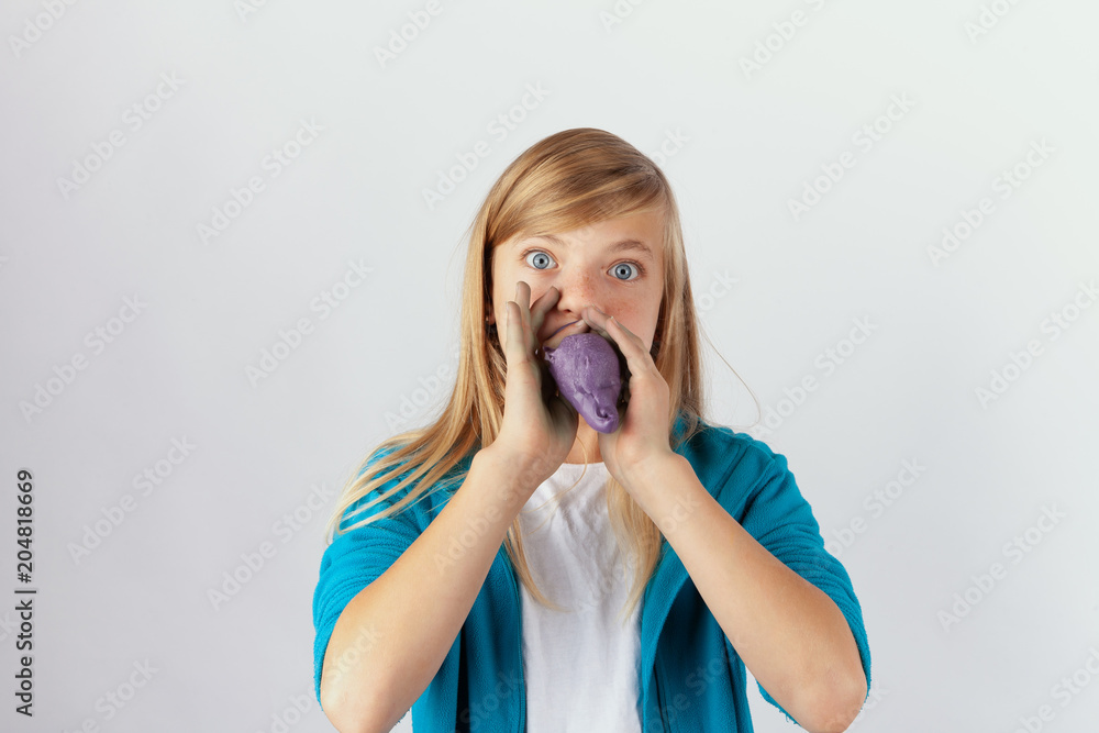 Cuge girl playing with her handmade purple slime in front of her f