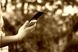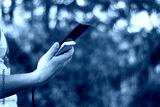 The guy is holding a portable charger with a smartphone in his hand. Man on a background of nature with greens