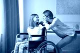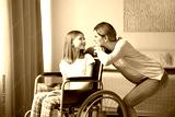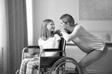 Young woman taking care of teenage girl in wheelchair indoors