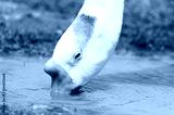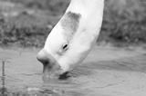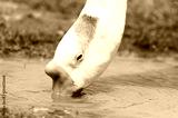 A white duck is searching for food