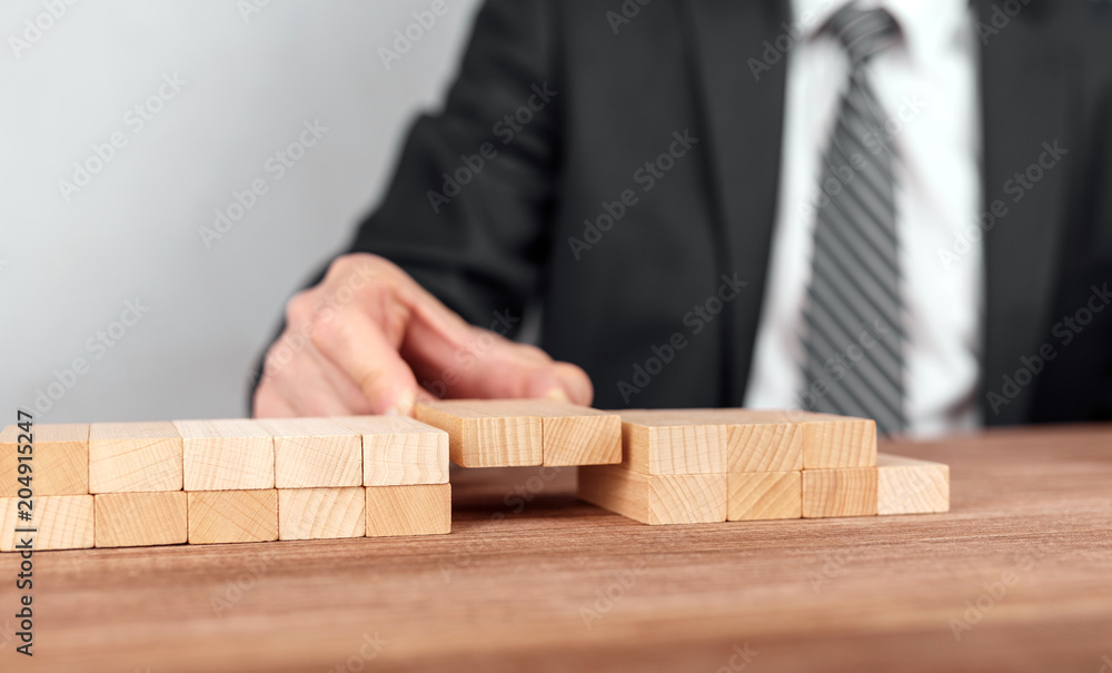 Close up of hand of businessman assembling a bridge made from little blocks.
