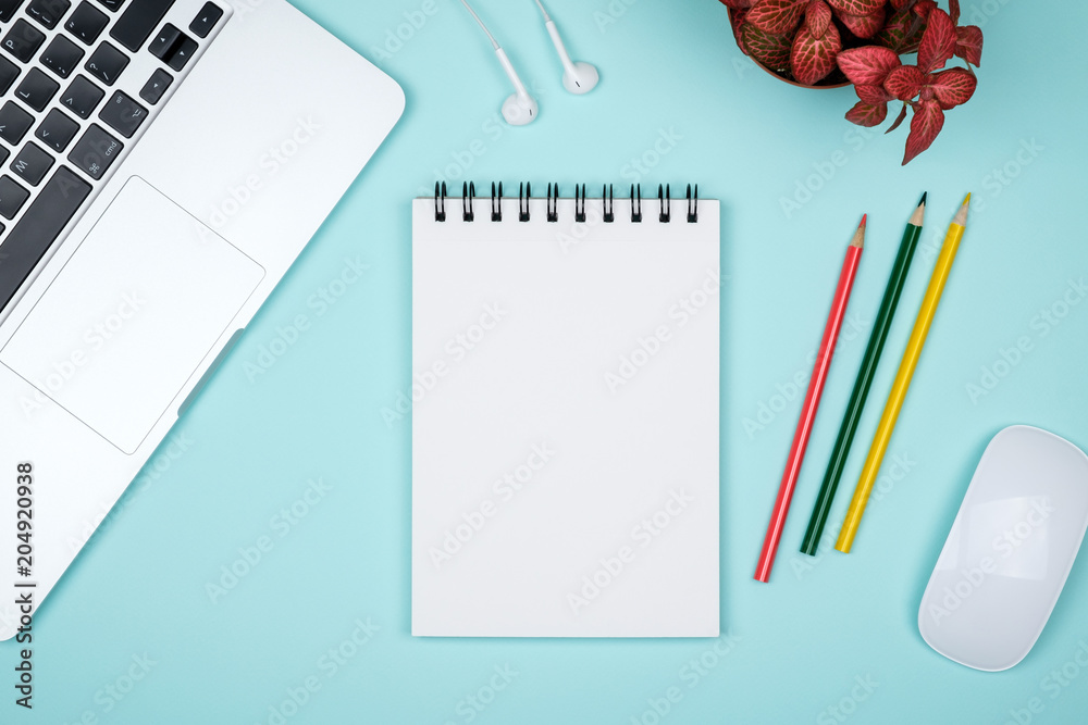 Modern office desk table with computer, blank notebook page and red plant