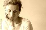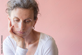 Head and shoulders view of middle aged woman with head resting on hand looking down against pink background (selective focus)