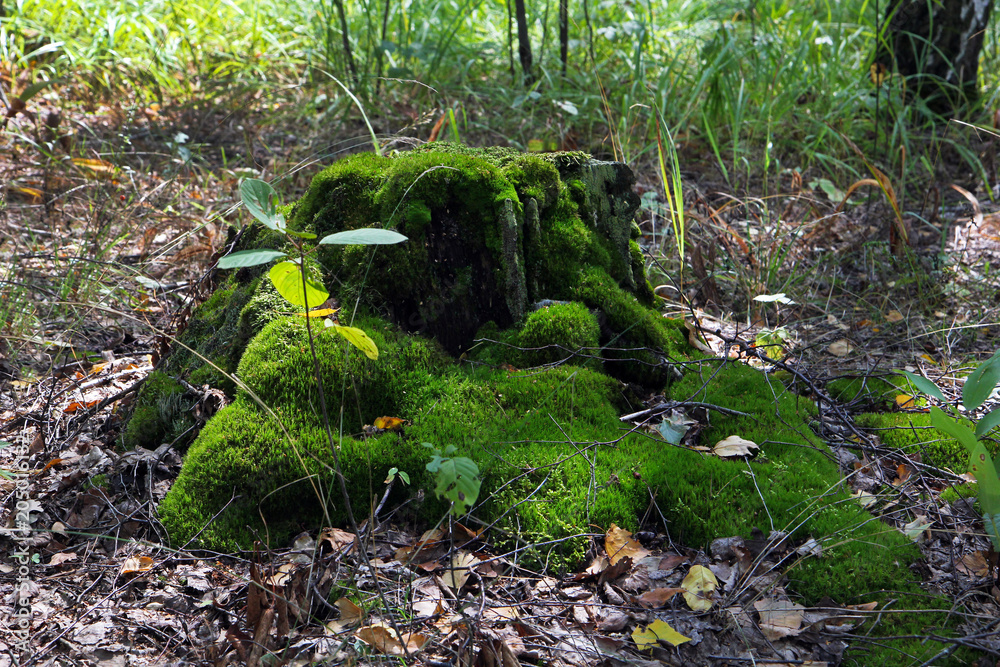 a stump covered with bright green moss among dry foliage and green grass in the background