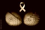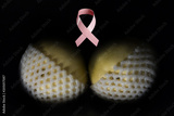 two yellow pears in white shells, similar to a bra with a pink ribbon in the middle above them, symbolizing the fight against cancer. Isolated on the black background
