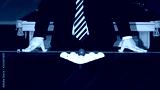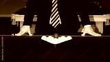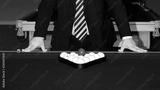 a man in a suit leans his hands on a pool table, on which there are billiard balls