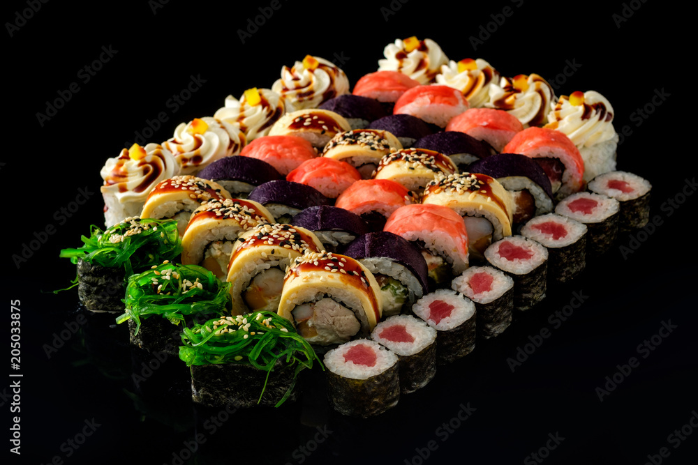 Fresh Sushi rolls set served on black background. Japanese seafood sushi