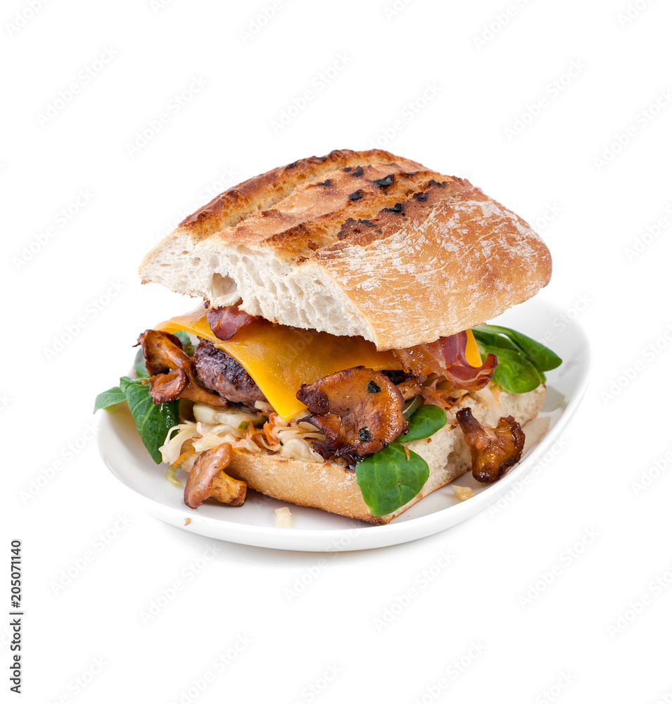 Burger handmade with beef chop and mushrooms chanterelles on an oval plate on a white background..