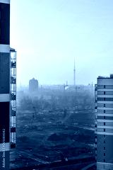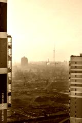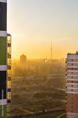 view of the residential area of St. Petersburg at sunset, construction site, yellow sky