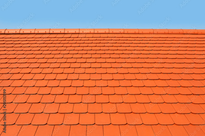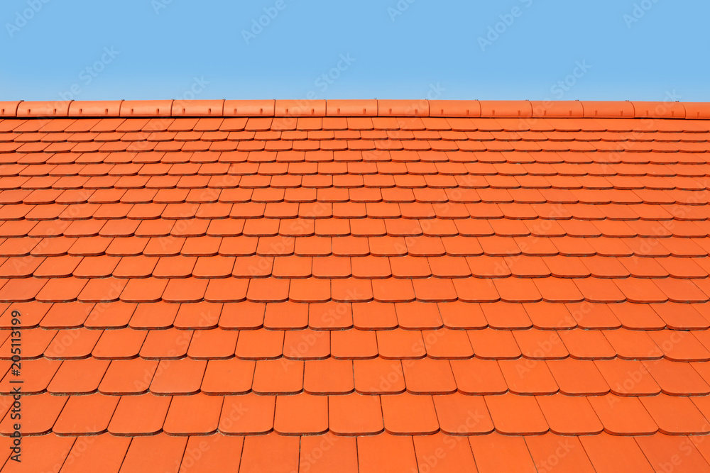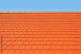 New, modern roof covered with flat, red, ceramic tiles.