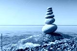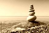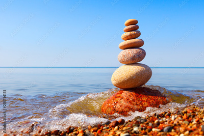 Rock zen pyramid of white pebbles in the pink rays of the rising sun against the calm summer sea