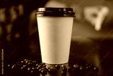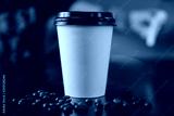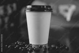 White paper cups of coffee with black caps presented in front grains lie on table. Food delivery concept
