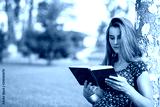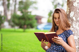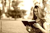 woman studying reading a book while sitting in campus