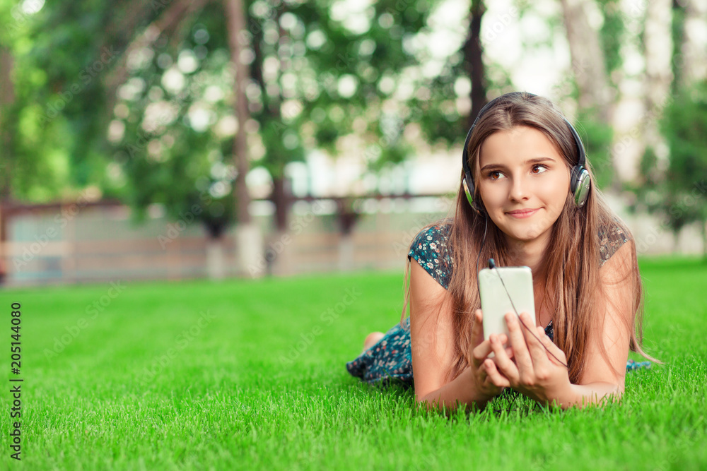 Daydreaming. Happy young cute student woman with smartphone headset on head listening to music looking away thoughtful pensive lying on green grass lawn in park. Mixed race