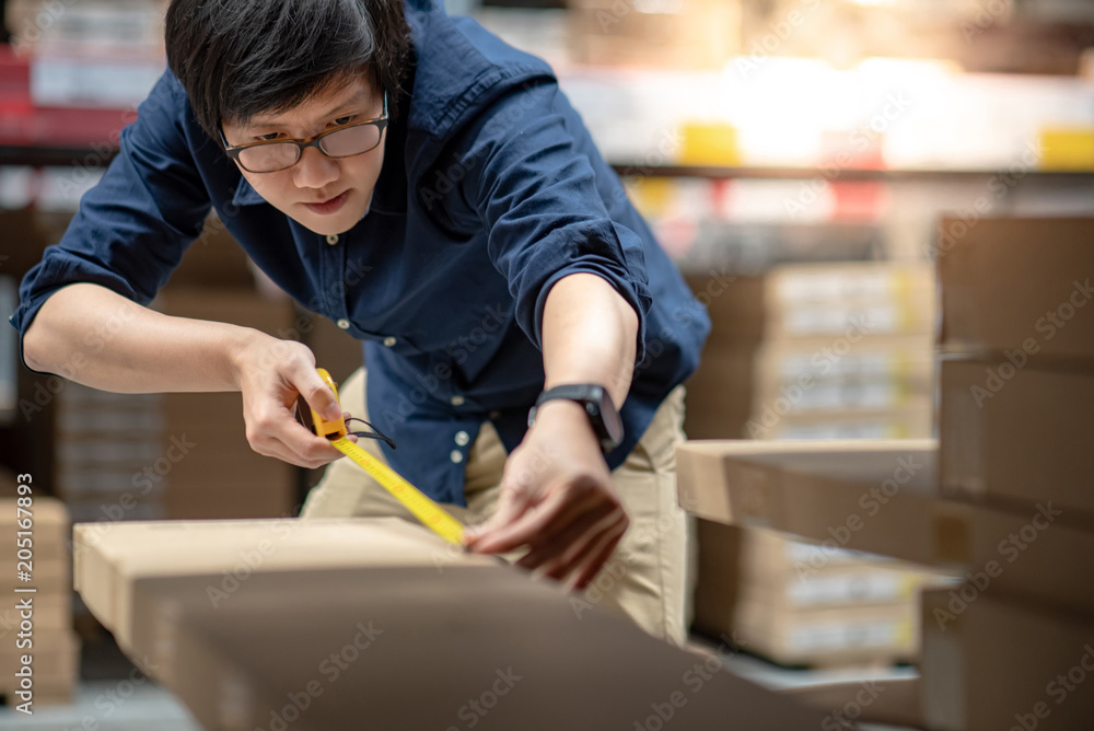 Young Asian man using tape measure for measuring dimension of product in cardboard box. Shopping lifestyle in warehouse concept