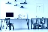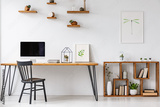 Black chair at table with computer monitor in bright home office interior with poster. Real photo
