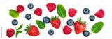 Various fresh forest berries isolated on white background, top view. Berry border frame. Flat lay.