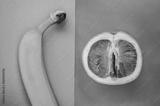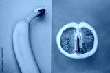 banana on a blue background of a grapefruit on a pink background. The concept of difference is gende