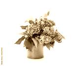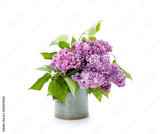 A bouquet of pink lilac in a ceramic vase on a clean white background. Isolated..